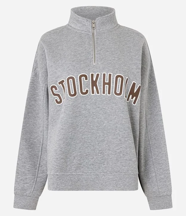Blusão feminino confeccionado em algodão certificado. Possui modelagem oversized, gola alta com fechamento por zíper frontal curto, mangas longas e acabamento nos punhos e na barra. Apresenta lettering aplicado no peito e estrutura confortável, indicada para uso casual.