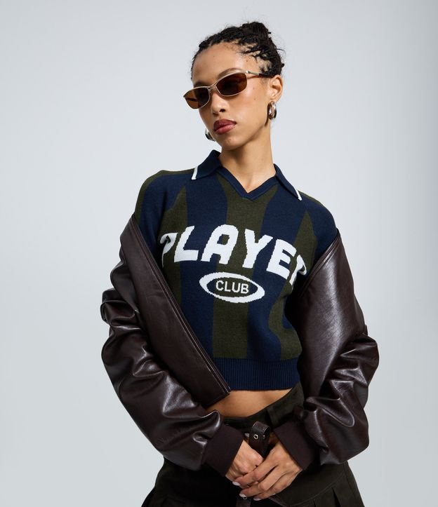 Blusão feminino confeccionado em tricô retilínea, com manga longa, gola polo e padronagem listrada em tons de marinho e verde, apresentando lettering frontal “PLAYER CLUB” em destaque que reforça o visual esportivo retrô. A modelagem confortável e o acabamento em tricô proporcionam estilo e aconchego, ideal para composições fashion com personalidade no dia a dia.