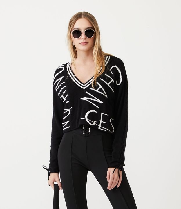 Blusão Suéter em Tricô com Amarração nas Manga e Lettering