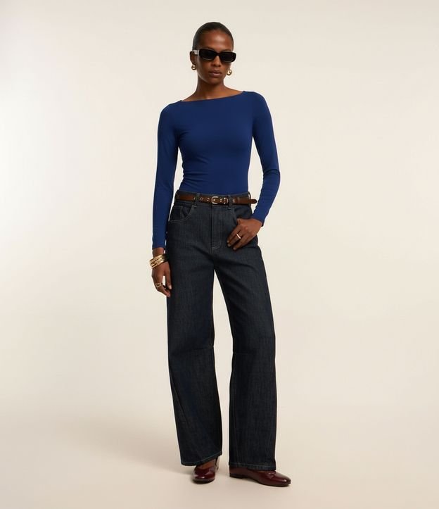 Body Básico em Poliamida com Gola Canoa Azul Marinho
