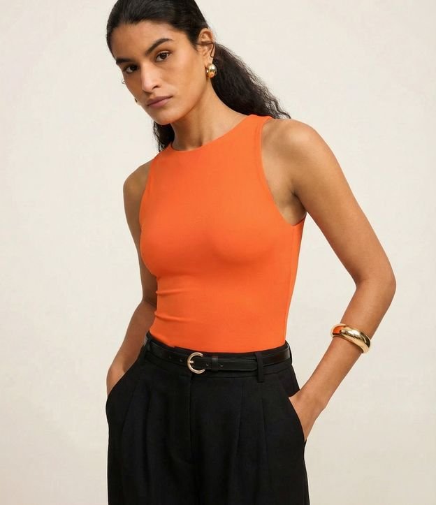 Body Básico em Poliamida com Gola Redonda Laranja