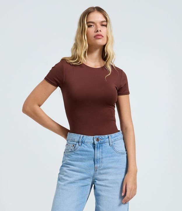 Body Básico em Poliamida com Mangas Curtas Marrom Médio