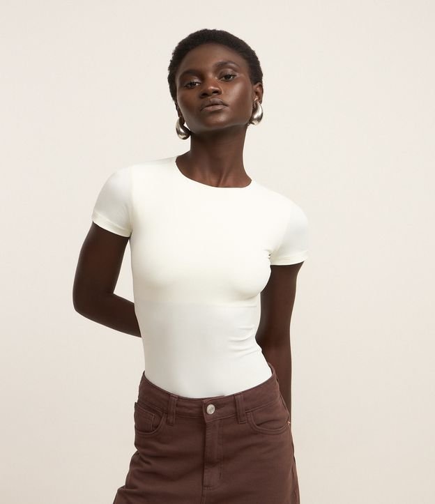 Body feminino confeccionado em malha de poliamida, com gola redonda e mangas curtas. O modelo não possui estampa e conta com fechamento entrepernas.