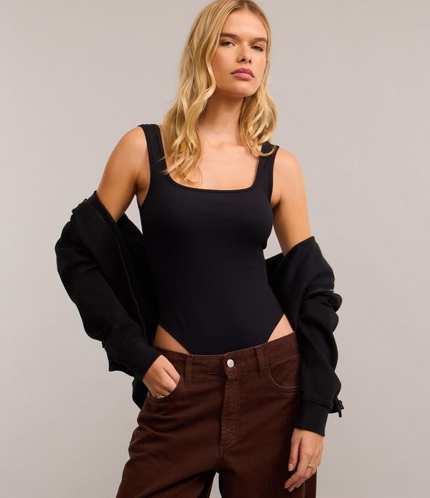 Body básico com alças largas, decote quadrado, leve textura e confeccionado em ribana.