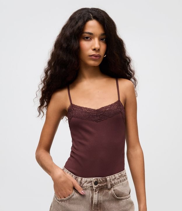 Body com Alça Fina e Renda no Decote Bordô