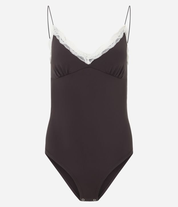 • Body em Microfibra com Alcinhas e Decote V Rendado Marrom 1
