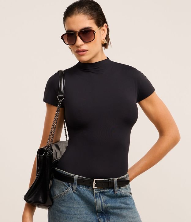 Body feminino, confeccionado em microfibra, com golinha média, mangas curta e superfície sem estampa.