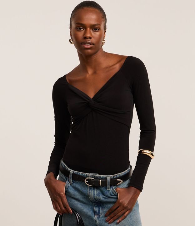 Body em Microfibra com Torcido no Busto e Decote V Preto