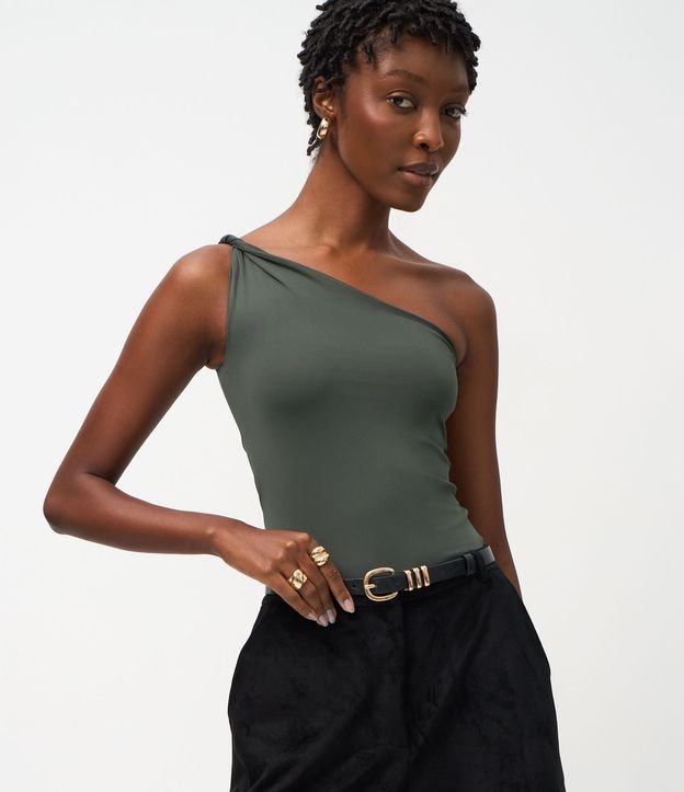 Body feminino confeccionado com poliamida. Possui modelagem justa, sem mangas, decote assimétrico de um ombro só, destaque para o detalhe torcido.