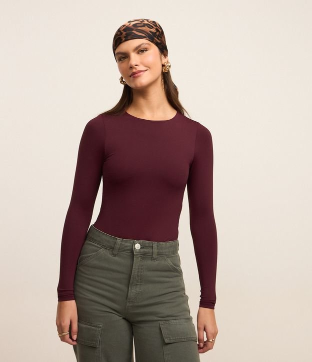 Body básico feminino, confeccionado em malha de poliamida com elastano, com gola redonda e mangas longas. Possui fechamento entrepernas.