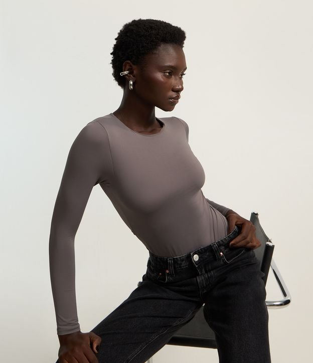 Body básico feminino, confeccionado em malha de poliamida com elastano, com gola redonda e mangas longas. Possui fechamento entrepernas.