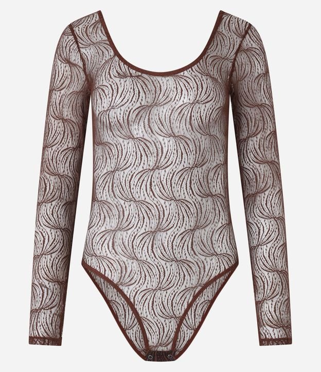 Body manga longa, confeccionado em tule com renda, leve transparência, manga longa e fechamento por botões de pressão entre as pernas.