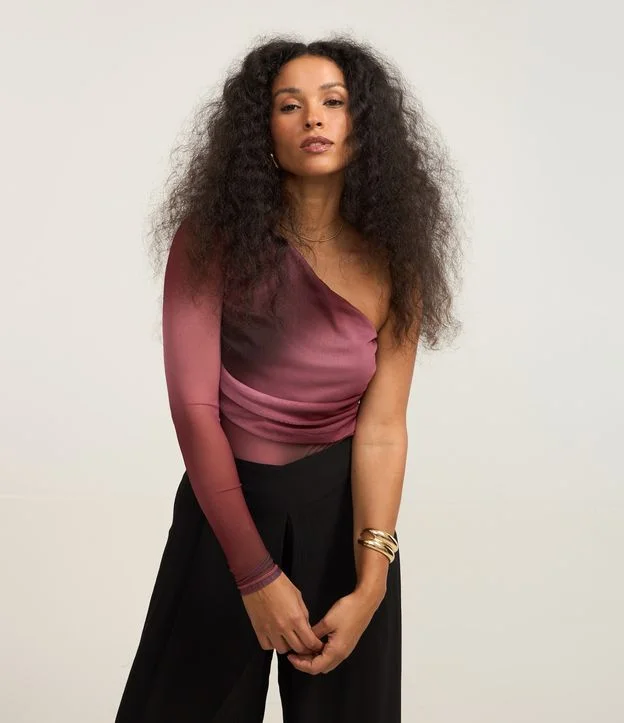 Body manga longa com decote um ombro só, confeccionado em tule com forro, estampa abstrata e drapeados laterais.