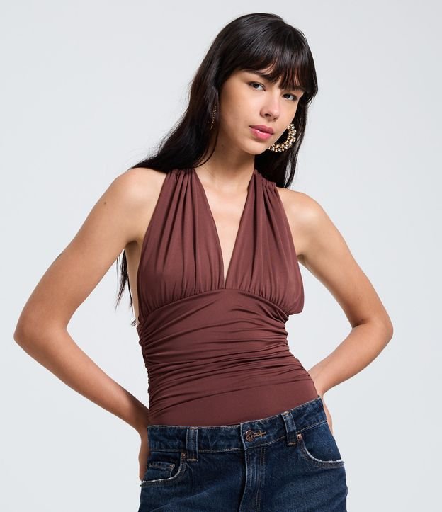 Body Frente Única com Recorte e Franzidos Marrom