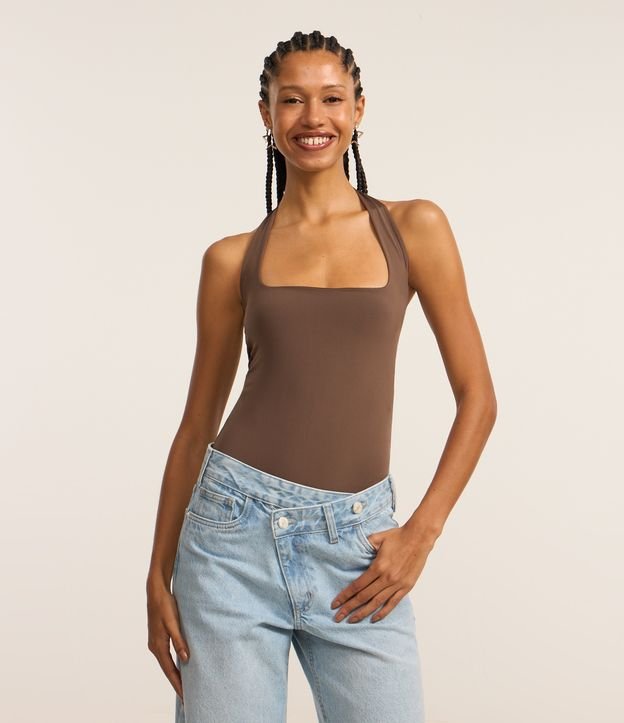 Body Frente Única em Microfibra com Decote Quadrado Marrom