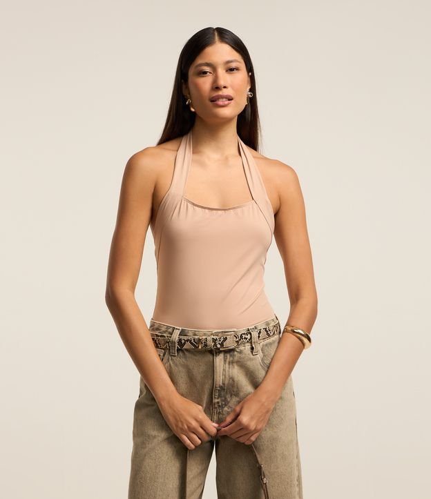 Body Frente Única em Microfibra com Decote Quadrado Bege