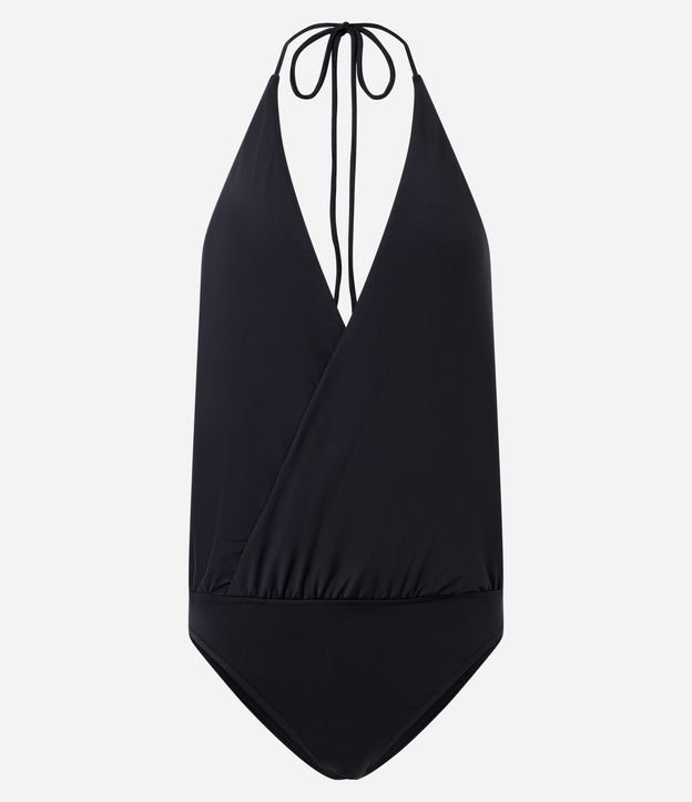 Body feminino frente única confeccionado em poliéster. Possui decote profundo em V transpassado, alças estilo halter ajustáveis por amarração na nuca e cintura levemente franzida para melhor caimento.