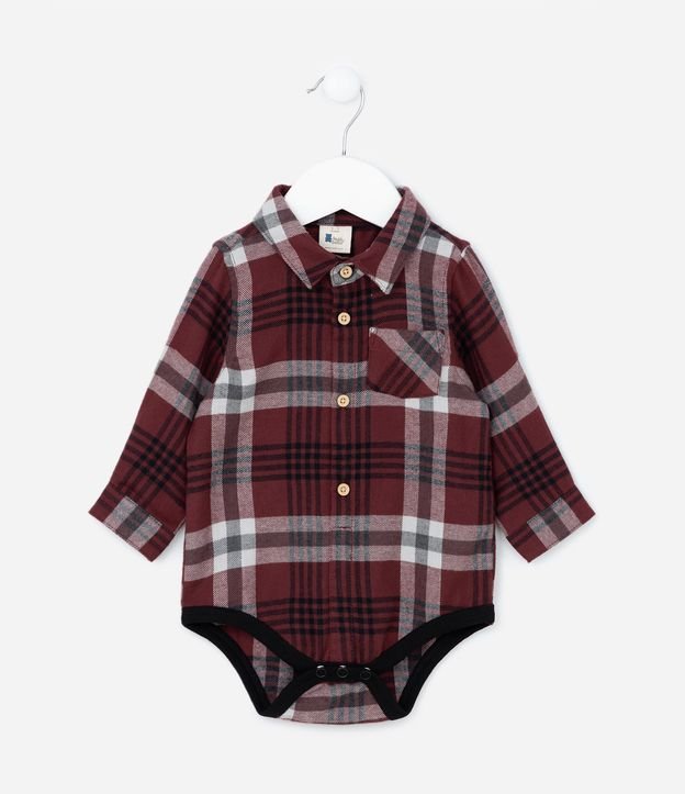 Body infantil confeccionado em flanela, de material mais sustentável, com gola colarinho e botões, manga longa e bolsinho no peito. Peça com estampa xadrez e fechamento no entrepernas.