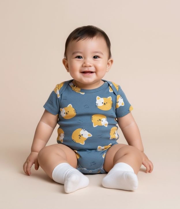 Body infantil confeccionado em algodão mais sustentável, com gola americana, manga curta com estampa de carinhas de gatinho. Possui fechamento no entrepernas.