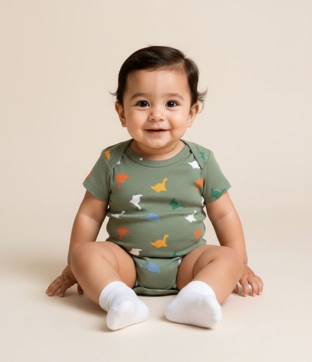 Body infantil confeccionado em algodão mais sustentável, com gola americana, manga curta com estampa de dinossauros. Possui fechamento no entrepernas.