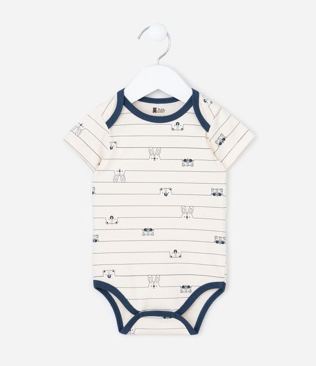 Body infantil confeccionado em cotton mais sustentável, com gola americana, manga curta, estampa de listras, bichinhos, viés contrastante e fechamento no entrepernas.