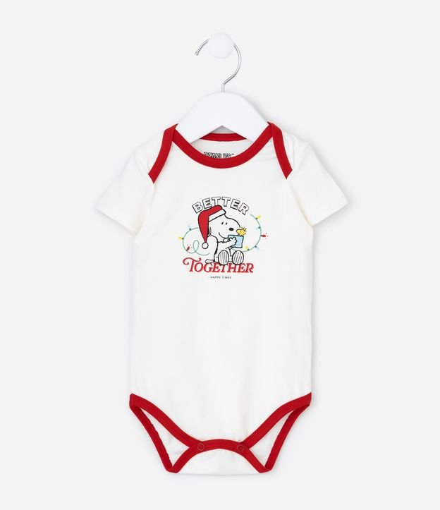Body infantil confeccionado em cotton mais sustentável através de boas práticas ambientais, com gola americana, manga curta, viés contrastante, com estampa de natal, do Snoopy e possui fechamento no entrepernas.