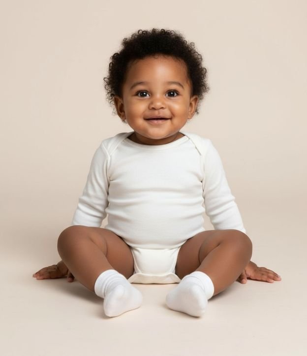 Body infantil confeccionado em ribana canelada, feito com material e boas práticas ambientais. Possui gola americana, manga longa, sem estampa.