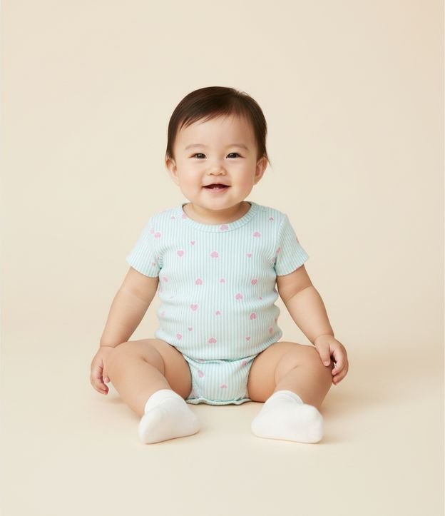 Body infantil em meia malha com listras verticais e estampa de conchas e corações distribuídos pela peça. Possui gola americana, mangas curtas e abertura inferior por botões de pressão, confeccionado em algodão certificado BCI e boas práticas ambientais.