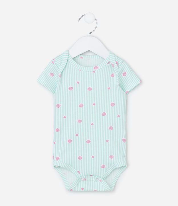 Body Infantil Listrado com Estampa Conchas e Corações – Tam RN a 18 Meses Verde Água