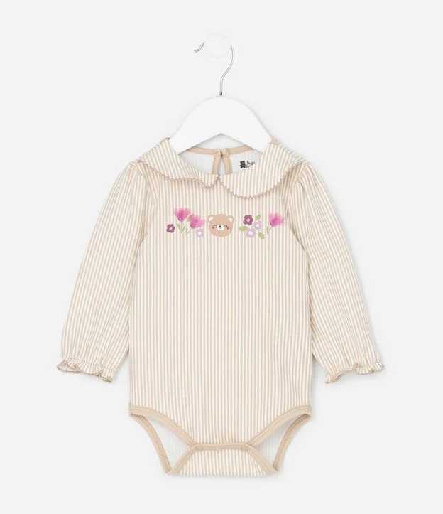 • Body Infantil Listrado com Flor em Organza – Tam 0 a 18 Meses Bege/Branco 1