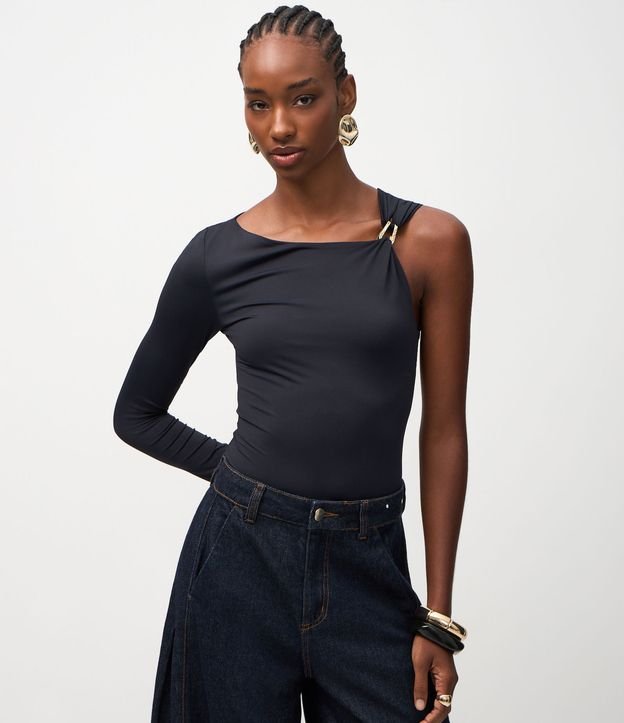 Body Manga Longa em Poliamida com Aviamento no Ombro Preto
