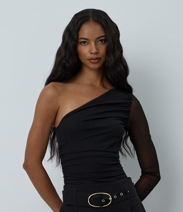Body em tule com design um ombro só e franzidos estratégicos que valorizam a silhueta. O modelo possui manga longa transparente e caimento ajustado, criando visual moderno e sofisticado. Ideal para compor looks noturnos cheios de estilo e personalidade.