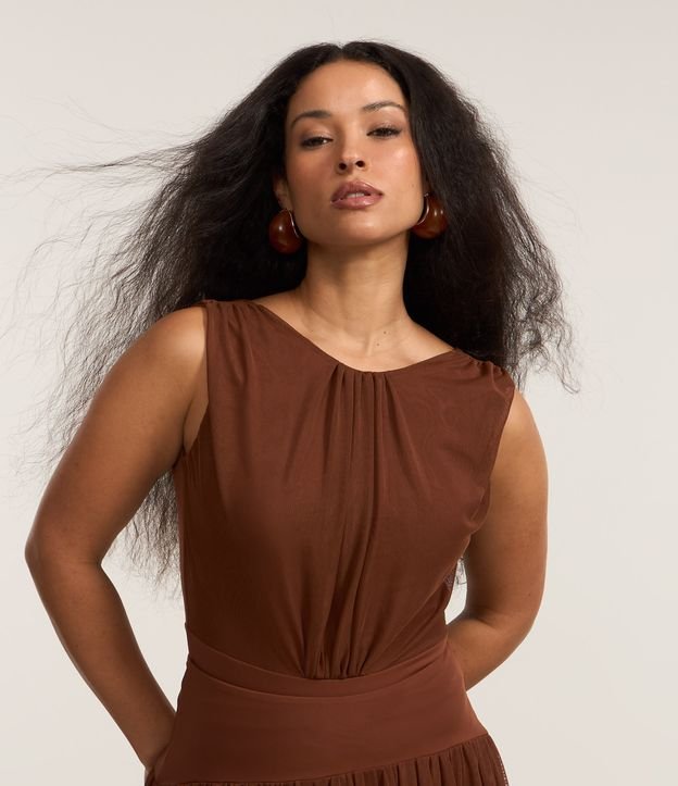Body Regata em Tule com Cinturão e Drapeados Marrom