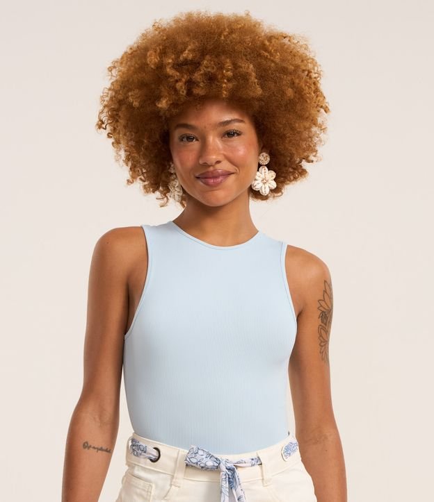Body feminino sem mangas, confeccionado em malha ribana de poliamida geladinha, com decote redondo e abertura entrepernas.
