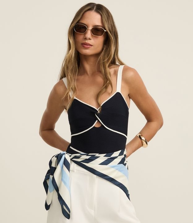 Body Texturizado em Tricô com Alça Fina e Viés Contrastante Azul Marinho