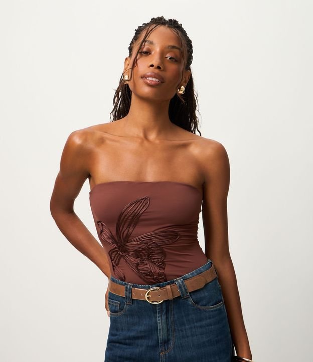 Body Tomara que Caia em Microfibra com Bordado Floral Marrom
