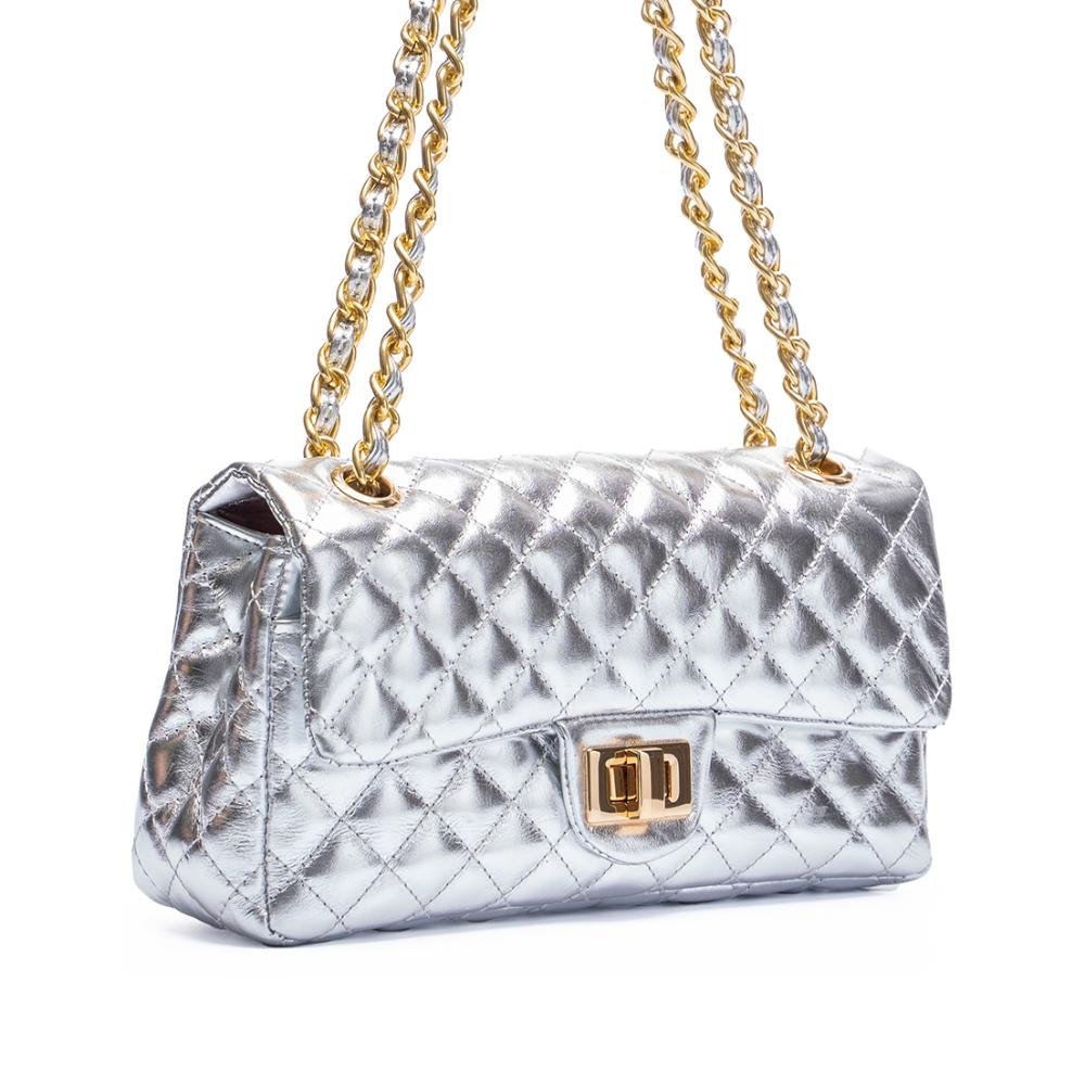 BOLSA COURO LEGÍTIMO QUILTED MÉDIA EM MATELASSÊ PRATA