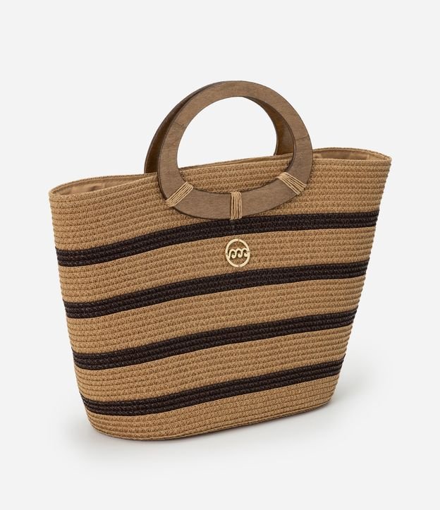 Bolsa de praia feminina em mix de palha, com estampa listrada. Possui formato rígido, tamanho pequeno, alça dupla circular, fechamento interno por botão de pressão e bolso interno funcional.