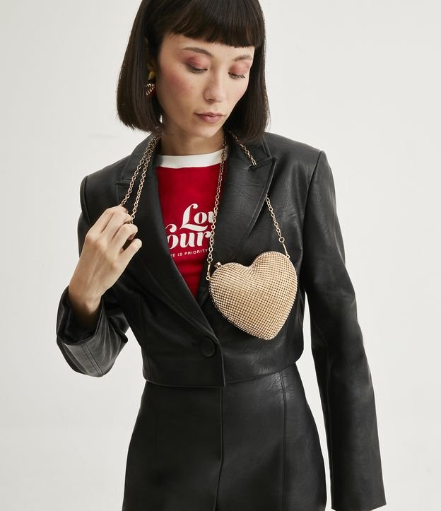 Bolsa Estruturada com Formato de Coração Forrada com Malha Metálica e Glitter