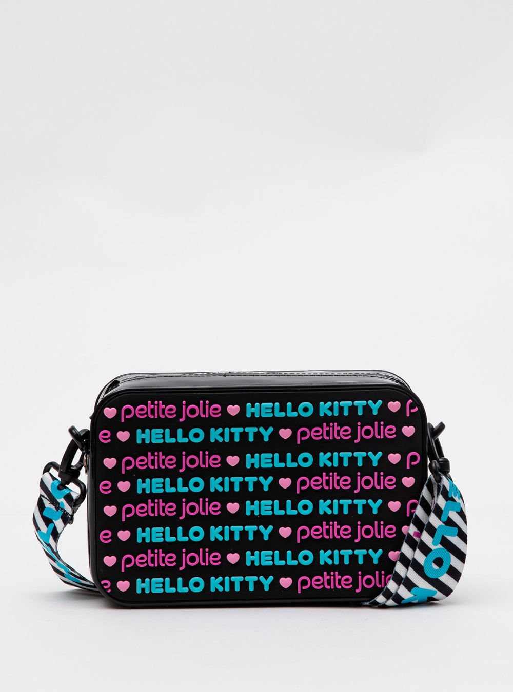 Bolsa preta em tamanho pequeno com estampa emborrachada com as marcas Petite Jolie e Hello Kitty. Possui alça de gorgurão regulável em estampa listrada preta com logomania. A alça é removível com base de gancho e possui fecho em zíper.