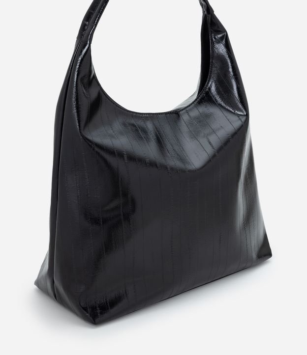 Bolsa feminina em PU confeccionada com poliéster mais sustentável. Possui tamanho grande, estilo hobo, abertura superior ampla, superfície texturizada com linhas discretas e alça larga fixa. A peça adequada tanto para o dia a dia quanto para produções mais modernas e urbanas.