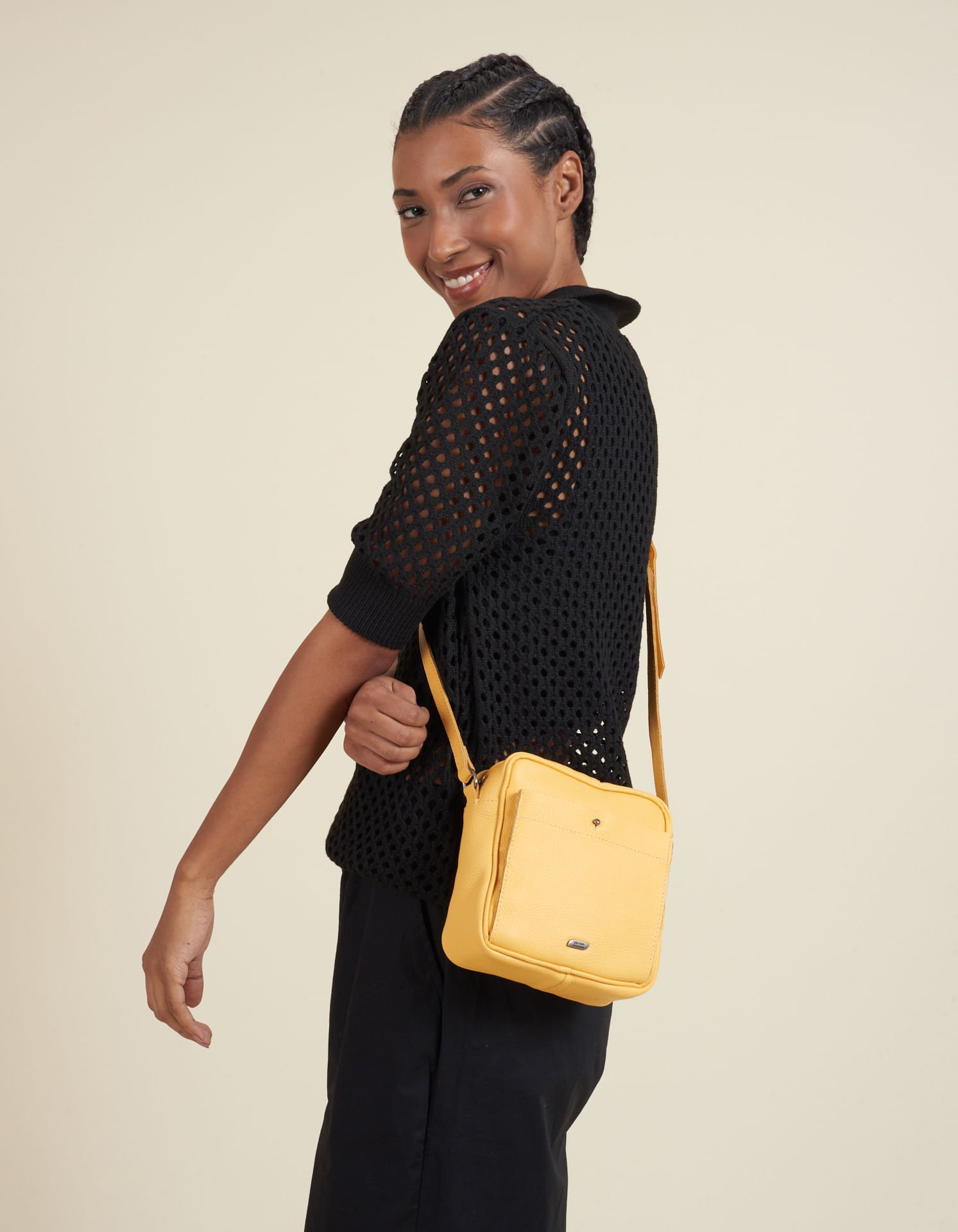 Bolsa Pequena de Couro com Bolso Frontal - Amarelo
