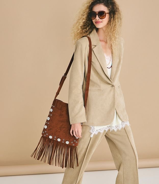 Bolsa Transversal Média em Suede com Franjas e Tachas