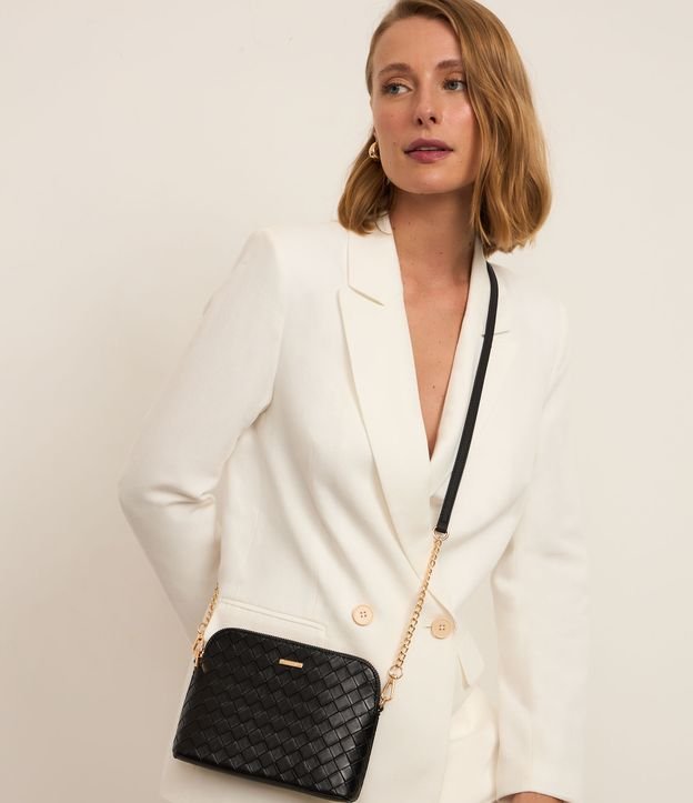 Bolsa Transversal Pequena com Efeito Tressê e Alça de Corrente Preto
