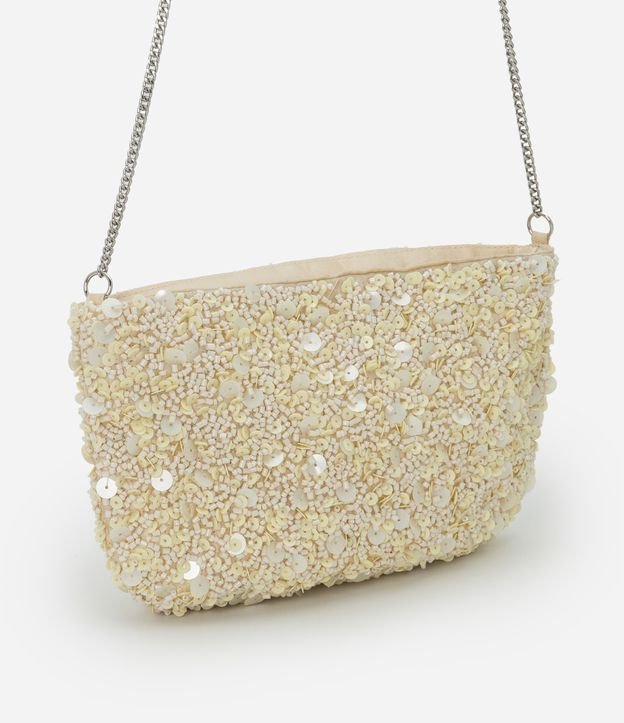 Bolsa Transversal Pequena em Paetês e Miçangas e Alça de Corrente Off White