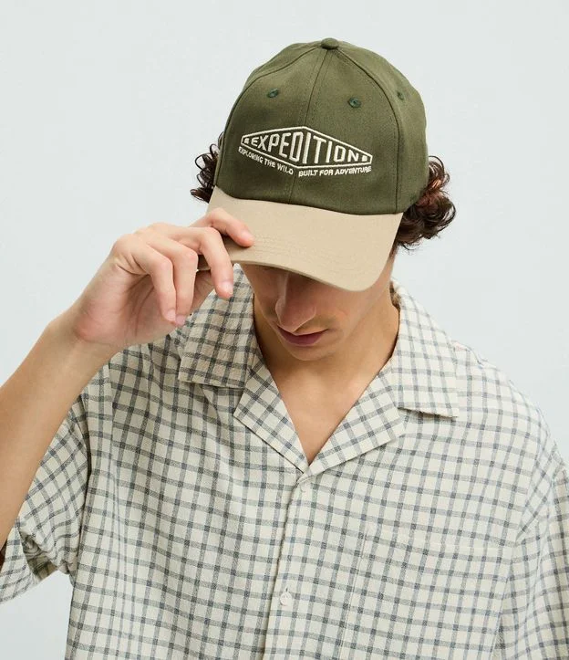 Boné masculino confeccionado em sarja de algodão mais sustentável. Peça com aba curva, estampa lettering bordada com a frase Expedition.