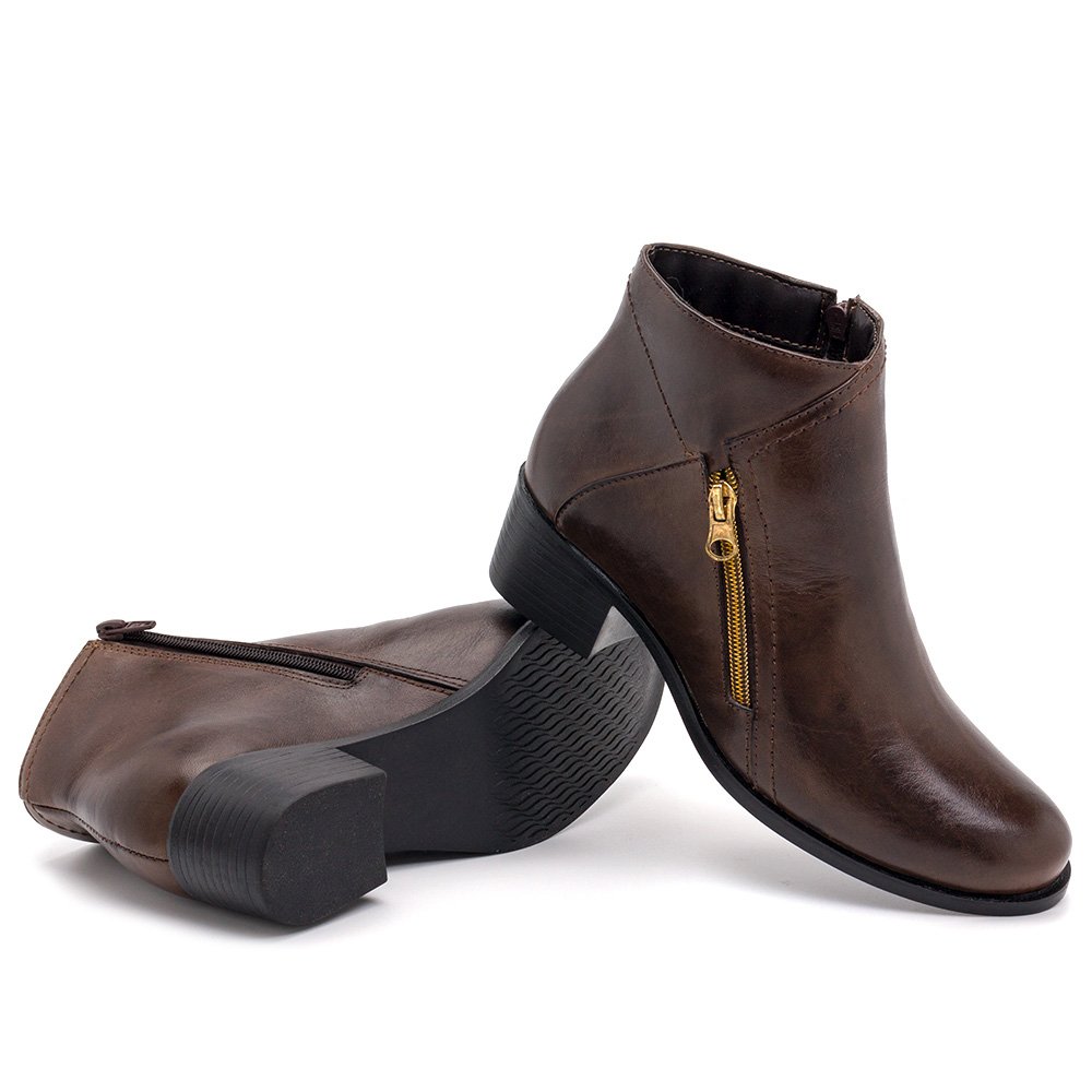 Bota Cano Curto Casual em Couro First Concept Lisa com Salto Quadrado Baixo