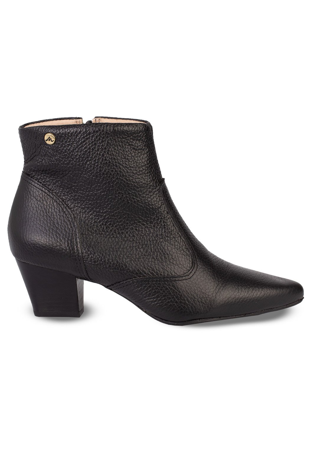 Botinha de couro legitimo, com salto inteiramente em borracha e seu bico e fino. A altura do salto proporciona extremo conforto para quem precisa caminhar o dia inteiro. Uma opcao leve, pratica e basica para todos os dias, independente de ocasiao. Material externo: Couro legitimo Altura do salto: 5 cm Altura do cano: 13 cm Largura do cano: 13 cm Modelo calca: Tamanho 37