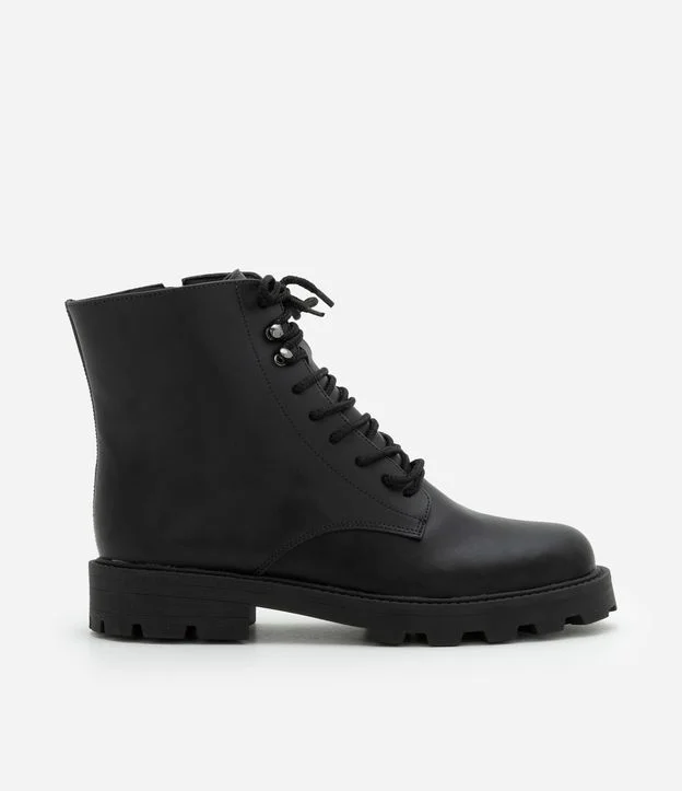 Bota feminina confeccionada em material sintético. Possui cano curto, bico redondo, sola tratorada, salto médio, cadarços frontais com passadores metálicos e zíper lateral.