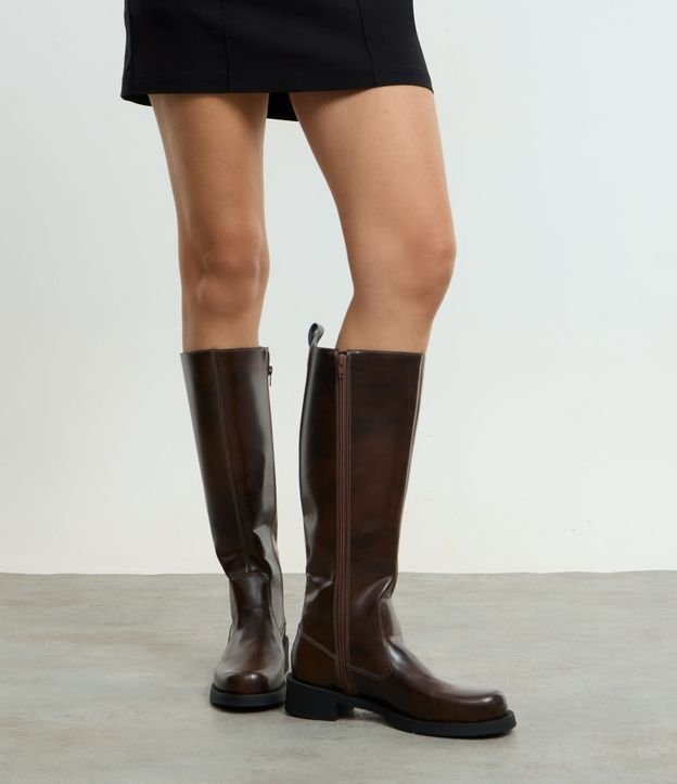 Bota Cano Médio em PU com Bico Redondo e Zíper Lateral Marrom